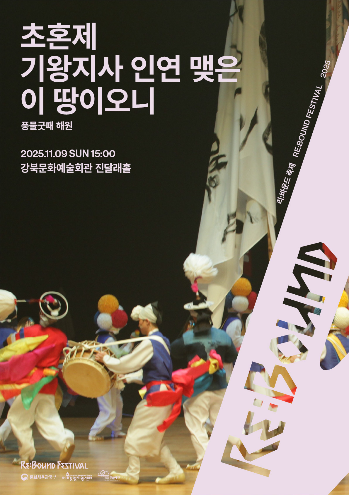 A new form of pungmul (Korean percussion ritual) combined with poetry. Inspired by poet Ko Jeong-hee’s long poem Rite of Summoning, it weaves storytelling with traditional performances such as pungmul-gut, ssitkim-gut, sori-gut, and ganggangsullae. The result is a vibrant experience akin to a traditional musical theater.