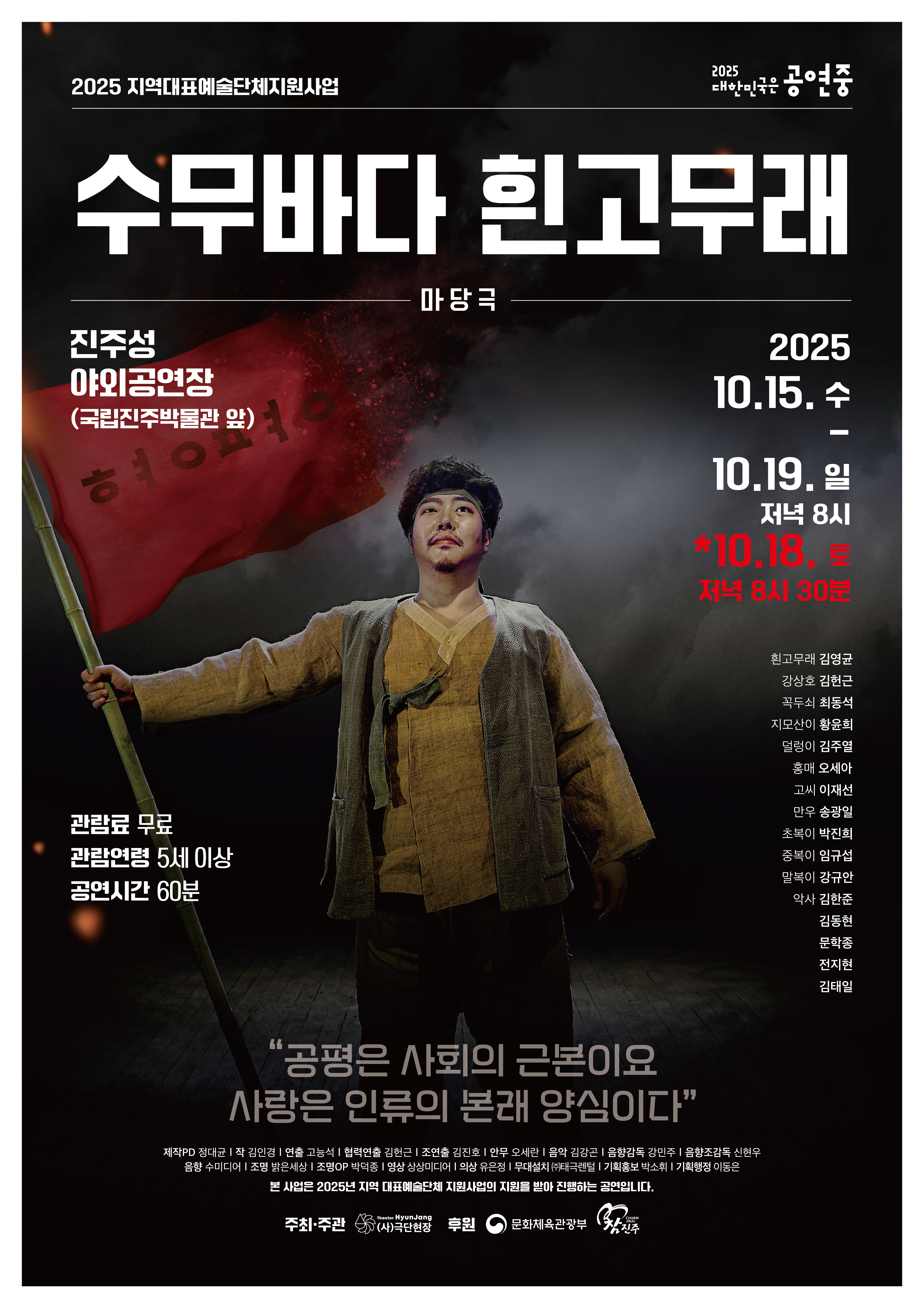 “Sumubada: White Paddle” is a madang-geuk (open-air folk theater) inspired by the 1923 Jinju Equality Movement against hereditary discrimination. Centered on the friendship and solidarity between White Paddle, the son of a butcher, and Kang Sang-ho, it portrays both the setbacks and the hopes of a struggle for liberation from caste and a shared yearning for a fairer world.